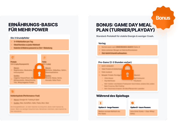 Bewährte 2-Phasen-Athletik-Trainingspläne, Video-Exercise-Library, Tracking-Sheet und Bonus-Dokumente für Ernährungsgrundlagen & Game-Day Meal Plan